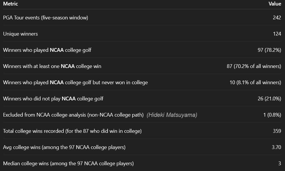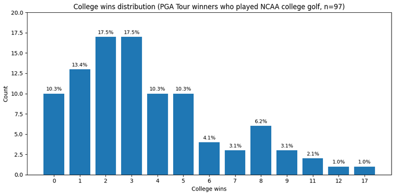 Next post: the 10 PGA Tour winners in our dataset who never won a college event, and what their careers had in common instead.