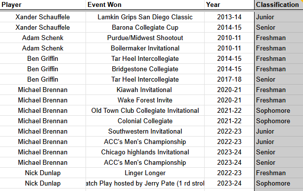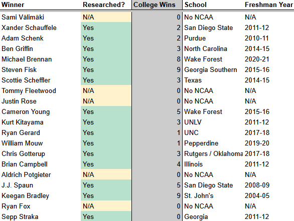 Another aspect I’d be interested in is looking at players who won a lot in college but have not become successful tour players. For example, there are probably quite a few players who won multiple times before their junior years that we’ve never heard of. We’ve talked about this as a group, and we’d love to look into this - it’s just a bit too expansive of a project right now.