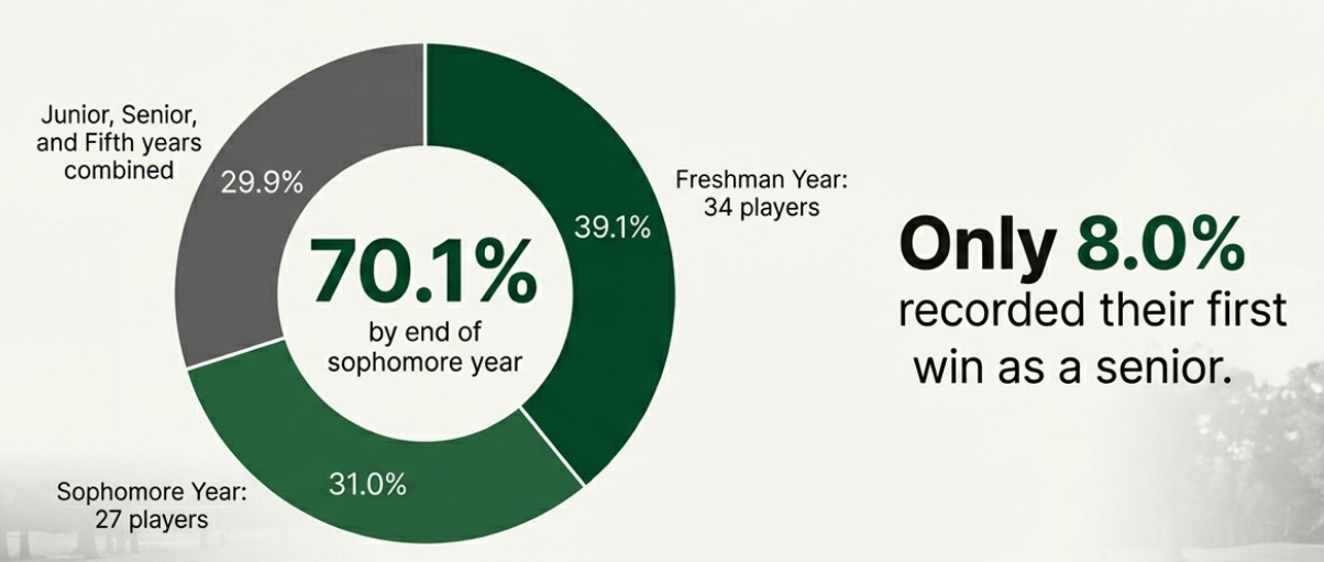 That does not mean you have no chance if you are not a freshman phenom. It does mean that the “PGA Tour winner” profile leans heavily toward players who learned to win early. The win timing suggests many were impact players early—either immediate lineup guys or fast risers.