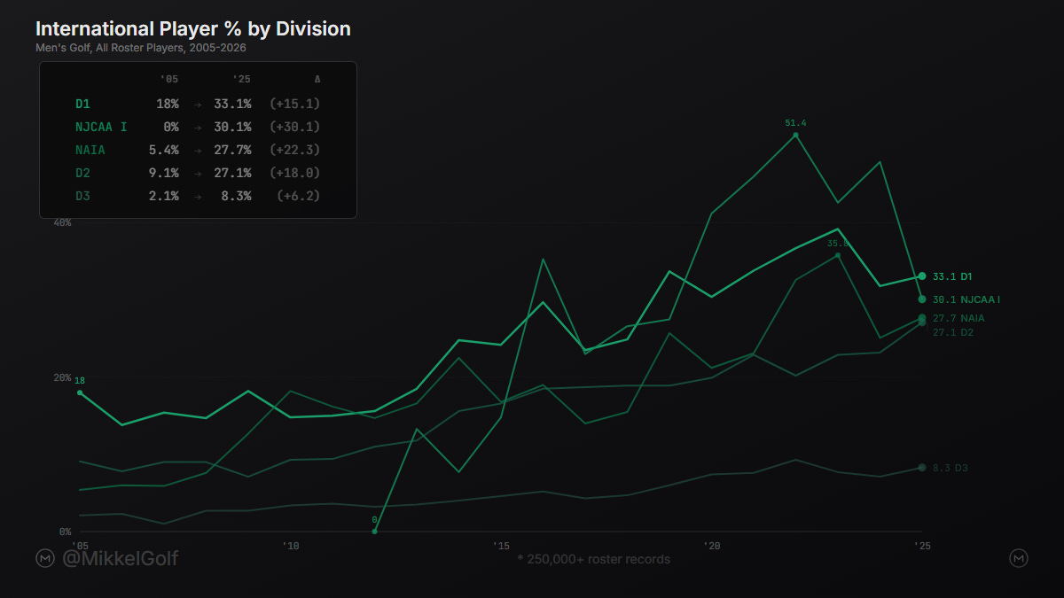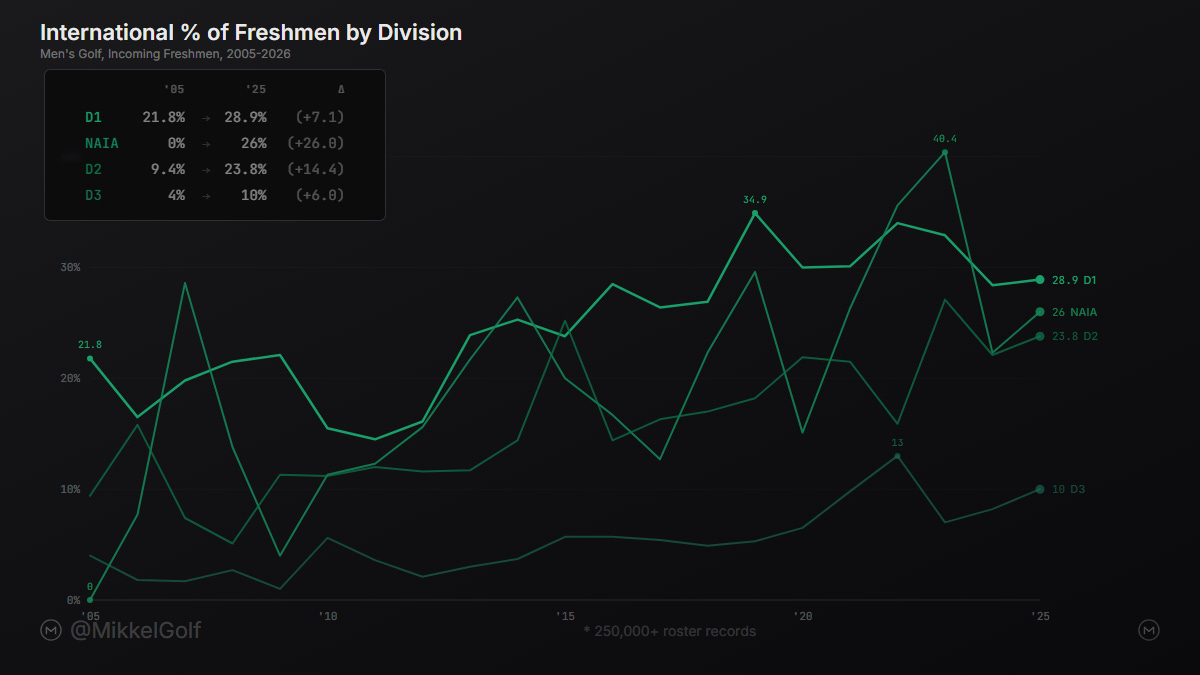 D1 isn’t alone. D2 and NAIA have experienced international growth that’s proportionally just as large. Twenty years ago, D2 was 8% international and NAIA was 4%. Now D2 is at 26% and NAIA at 33%. If you’re a U.S. high school golfer who doesn’t quite have the resume for D1 and is looking at D2 or NAIA, the competitive picture has changed there too.