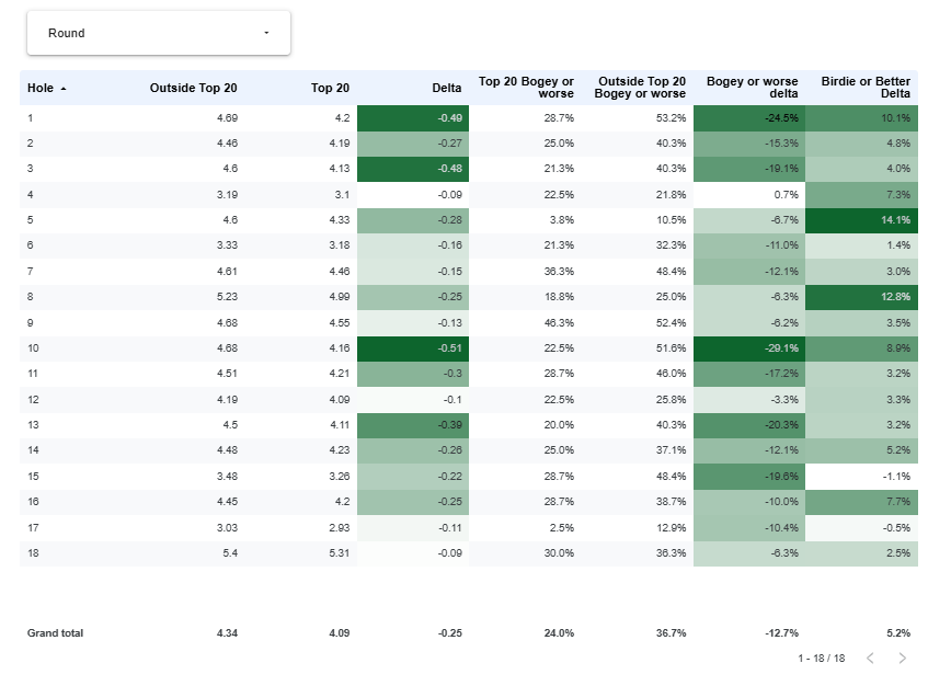 A side-not to this point: The two holes with the biggest delta in birdie or better percentage (14.1% and 12.6%), were the only reachable par-5s on this course.