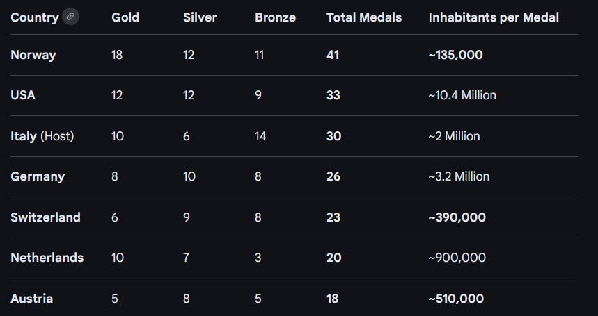Norway finished with 41 total medals and 18 golds, both single-Olympics records. When you look at medals per capita, it is not even close. That number deserves a small caveat though - Norway is a winter country, and in cross-country skiing a single athlete can enter everything from the sprint to the 50km. It’s not like a runner in the Summer Olympics can win both the 100m and the marathon. Klæbo’s six gold medals inflate the count in ways other nations simply cannot match.